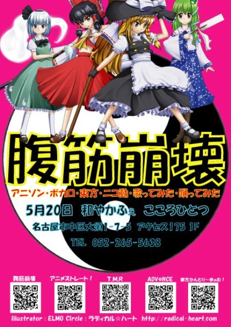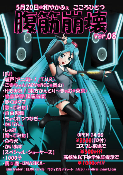 いよいよ明日です お待ちしておりまーす 第8回開催決定!! 【日時】 5月20日(日曜日) open 14:00-23:00(終了予定) 【場所】 和やかふぇ こころひとつ 名古屋市中区大須1-7-5 アクセス175 1F TEL 052-265-5638 【料金】 ・当日 \2,500 (1ドリンク券付き) ・チケット予約 \2,000 (1ドリンク券付き) *チケットご予約はこちらからお願いします↓ http://mixi.jp/view_bbs.pl?id=69254030&comm_id=5351882 ※コスプレ来場で\500 OFF!! ※学生割引(高校生以下)学生証提示で¥1000OFF!!