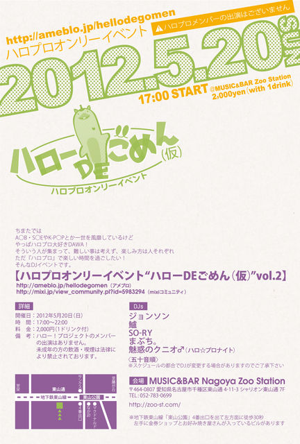 【ハロプロオンリーイベント“ハローDEごめん(仮)”vol.2】 開催日:2012年5月20日(日) 時 間:17:00〜22:00 料 金:2,000円(1ドリンク付) 会 場:MUSIC&BAR Nagoya Zoo Station (名古屋・東山) http://zoo-st.com/ 備 考:ハロー!プロジェクトのメンバーの出演はありません。 未成年の方の飲酒・喫煙は法律により禁止されております。 ◆Live 音華花 ◆DJs ジョンソン 鱸 SO-RY まぶち。 魅惑のクニオ♂(ハロ☆プロナイト) <五十音順> ※スケジュールの都合でDJが変更する場