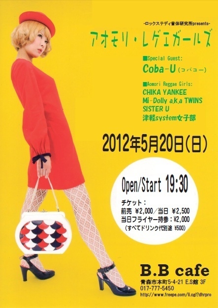 ■2012年05月20日(日) 「アオモリ・レゲエガールズ」 Special Guest: Coba-U Aomori Reggae Giris: CHIKA YANKEE Mi-Dolly a.k.a TWINS SISTER U 津軽system女子部 Open/Start19:30 チケット: 前売 り¥2,000/当日¥2,500 当日フライヤー持参:¥2,000 (すべてドリンク代別途¥500) B.B cafe 青森市本町5-4-21 E.S館 3F 017-777-5450