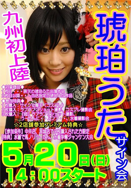 ★九州初のイベント★ 琥珀うた サイン&撮影会!! 5月20日(日) 14:00スタート 詳しい詳細はブログにて http://blog.livedoor.jp/stallion_honjo/ Web検索は スタリオン本城店