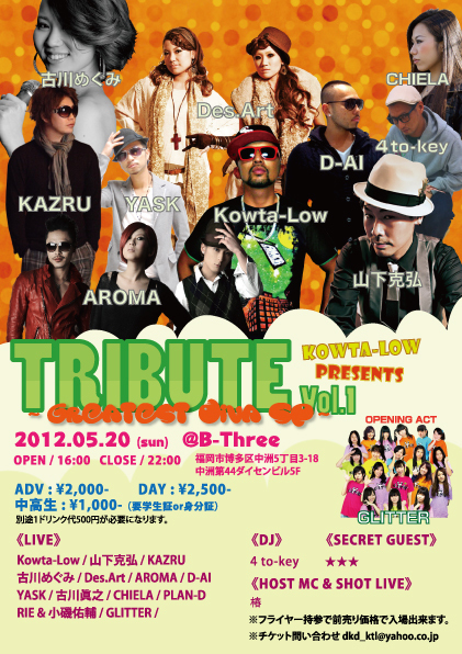 「TRIBUTE vol.1」 開催日: 2012年5月20日(日) 会場:Music space B-three Open:16:00〜 Close:22:00 Ticket 前売り:2000円/当日:2500円/中高生:1000円(学生証or身分証が必要) ※別途で1ドリンク代500円が必要になります。 出演者 ○LIVE○ Kowta-Low/山下克弘/KAZRU/古川めぐみ/Des.Art/AROMA/D-AI/YASK/古川眞之/CHIELA/PLAN-D/RIE&小磯佑輔 ○DJ○ 4to-key ○Host MC & SHOT LIVE○ 椿 ○featuring secret GUEST○ ☆☆☆ ○オープニングアクト○ GLITTER