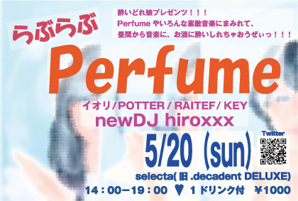 管理人様スペースお借りします。 --------------------- らぶらぶPerfume vol.5開催!!! JPNツアーも終盤戦。 ですがまだまだPerfume成分は足りないですよね!? まだまだLIVE参戦&遠征組たくさんいらっしゃいますよね!? 今回は沖縄公演一週間前に、 LLPでテンションあげあげでいくぞっ! ってことで、 5/20(日)に、らぶらぶPerfume5を開催致します! らぶらぶPerfumeは、 Perfume好きな人達が集まって、 Perfumeを聴いて、Perfumeで飲んで、 Perfumeを語っ