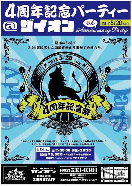 皆様のお陰で、この度ザイオン薬院店は 4周年を迎える事が出来ました(^ー^) これからも更に皆様に愛されるお店に (ただいま)と言いたくなるような空間になるように スタッフ一同努力して参りますので、 今後ともよろしくお願いします。 そして今回ZIONスタッフ一同感謝の気持ちを込めて 4周年パーティーを開催させて頂きます★☆ いつもザイオンに来て頂いている方も、 まだザイオンに来た事がない方も 一緒になって楽しみましょう★ ★☆ZION4周年パーティー☆★ ■開催日時 5月20日(日曜日) 受付 20:0