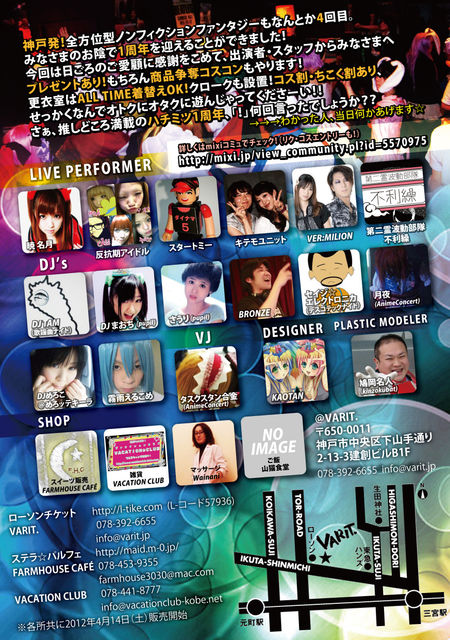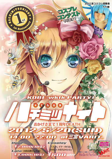 管理人様 コミュメンバーの皆様 いつも御世話になっております。 この度は貴重なスペースお借りいたしますm(_ _)m 不適切な表現などございましたら、削除くださいませ。 「ハチミツナイト 4th公演 Ψおかげさまで1周年DeathΨ」 ○2012年5月20日(日) @三宮VARIT. ○Open/Start 14:00 Close 22:00 ○料金\2000(1D付) ※コス割 \500引き(受付で衣装見せてくださいね) ※ちこく割 \1000(1D付)・・・20時以降にご入場の方 ※クロークあり・・・出し入れ自由\500-