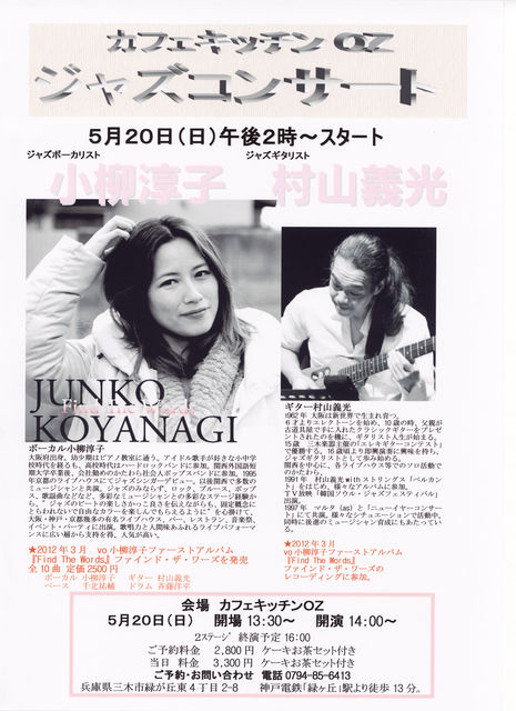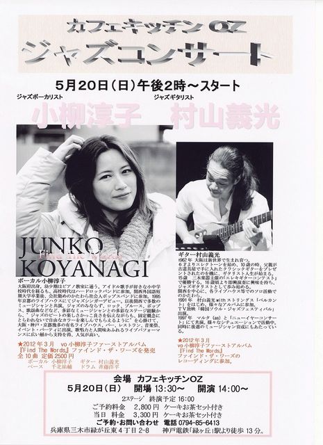 少し遠出してみませんか vo小柳淳子ファーストアルバム『Find The Words』 発売記念LIVE Duoバージョン ★5月20日(日)14:00〜兵庫県三木市【カフェキッチンOZ】 http://ozck.web.fc2.com/ open 13:30 start 14:00〜16:00 (2セット) vo小柳淳子 g村山義光 ご予約料金 2800円 ケーキとお茶が付いています 当日 料金 3300円 ケーキとお茶が付いています 兵庫県三木市緑が丘東4丁目2-8 ご予約・お問い合わせ 電話▼0794-85-6413 神戸電鉄「緑ヶ丘」駅より徒歩13分。