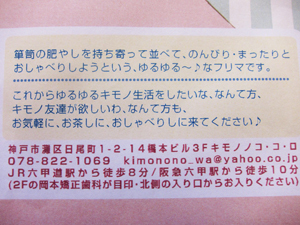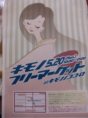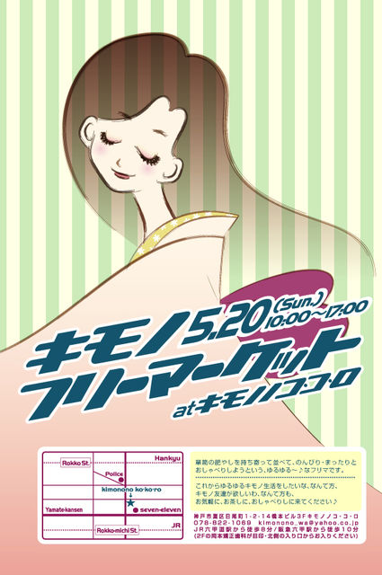 前回ご好評いただいたゆるゆるキモノフリマを開催いたしますので ご案内させていただきます。 「キモノ 5.20 フリーマーケット」kimononokokoro ■時: 2012年 5月 20日(日) 10:00〜17:00 ■場所:神戸市灘区日尾町1-2-14 橋本ビル3F JR六甲道駅/阪急六甲駅より徒歩8分 ■ 箪笥の肥やしを持ち寄って並べて、のんびり・まったりとおしゃべりしようと いう、ゆるゆる〜♪なフリマです。 多分、ナントカの逸品!みたいなお品はないけど 多分、ふだ