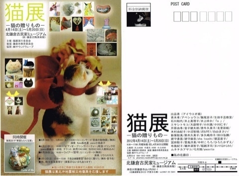 期日:4月14日(土)〜5月20日(日) 9:30〜17:00 月曜日は休館(但し4月30日は開館) 会場:古民家ミュージアム (前:古陶美術館、JR北鎌倉駅下車、徒歩2分、円覚寺右隣) 入館料:大人¥500中高生¥300小人¥200 イベント: 同時開催 飯尾京子「華麗なる七宝展」 ゴム版画ワークショップ 子供のアート体験教室(無料) ミニコンサート 猫小物が当るくじ引き(チャリティ)他 春の花が溢れる北鎌倉へぜひ遊びにいらして下さい^^