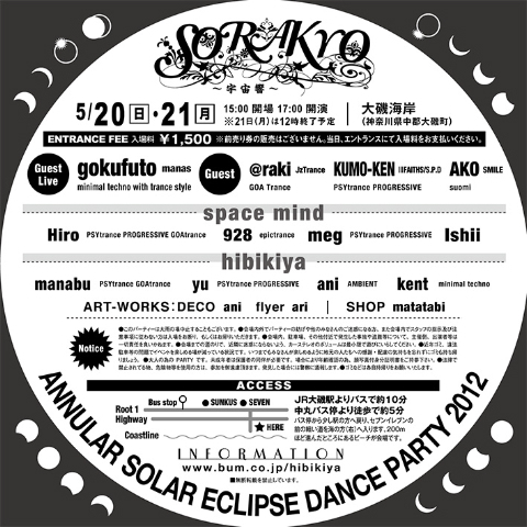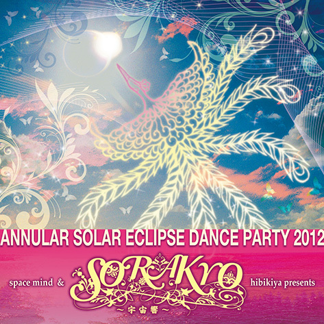 ★★★宇宙響 〜sorakyo〜★★★ annular solar eclipse 2012 宇宙(spacemind)+響(hibikiya)=宇宙響〜sorakyo〜 present by hibikiya & spacemind 宇宙響 〜sorakyo〜 とは、 今年5月21日に起こる金冠日食の DANCEParty!! hibikiya & spacemind が手を組んで開催される。 ハウス・テクノ・アンビエント・トランス・をはじめアートやパフォーマンスなどダンスミュージックシーンを中心に、様々なジャンルが一同に集結する音楽祭。 都内クラブや各パーティーで、PLAYするDJ陣やオーガナイザーなど所属の垣根を越え、手