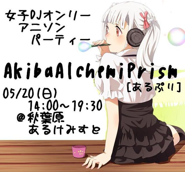 05/20_AkibaAlchemiPrism(女子DJオンリーアニソンパーティー)【あるぷり】 04/29(日)に行われた、 女子DJオンリーアニソンパーティー、 AkibaAlchemiPrism【略して、あるぷり】が、 05/20(日)の、お昼のイベントとして開催します♪(o´▽`o)v。 あるけみすとの通常バー営業や、他のイベントでプレイしているDJと、 あるけみすとでキャストとして活躍しているキャストDJとの、 合同イベントです(v´∀`)ハ(´∀`v)。 メジャーなアニソンはもちろん、 東方/ボーカロイド/声優/特撮/腐女子/アイドル等も、やっちゃいます〜><。 初め