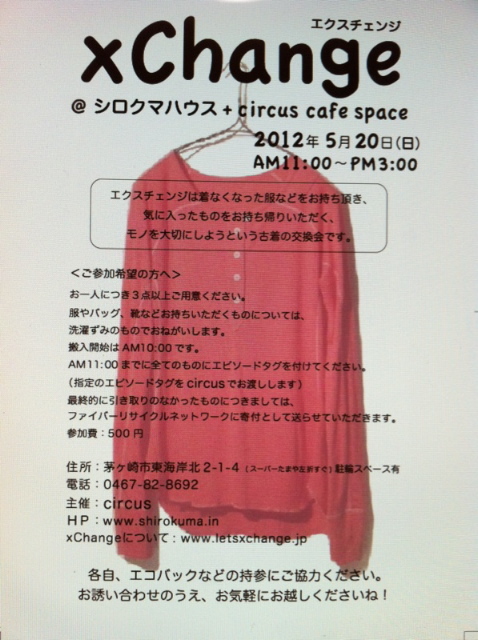 xChange 茅ヶ崎 日時:5月20日(日)11:00〜15:00 会場:シロクマハウス及び1階サーカスカフェスペース 所在地:神奈川県茅ヶ崎市東海岸北2−1−4 交通:JR東海道本線「茅ヶ崎駅」徒歩3分 参加費:500円(会場協力費) シロクマハウスHP:http://shirokuma.in/ お問合せ先:circusまで 0467-82-8692 facebook:https://www.facebook.com/pages/Circus/174351239346472 ※持ち込み数、時間などルールがあります。 フライヤーにて詳細をご確認下さい。 ----------------------------------------------- ※注意 こちらは開
