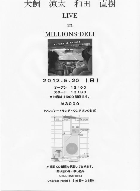 犬飼涼太和田直樹LIVE 第2弾!!!!! 今回は神奈川県は横浜市中区山下町にある、『MILLIONS-DELI(横浜市中区山下町194-3 ニューポートビルB1F)というお店で行います。 OPEN 13:00 START 13:30 TICKET ¥3,000(ワンプレートランチ・ワンドリンク付きで♪) 最寄りの駅は、 【JR 関内駅】徒歩8 分 関内駅南口を出てスタジアム方面へ信号を渡り、横浜公園内をスタジアムを右手に見つつ一番奥の大きい出口を目指してください。横浜公園出口を出たら右方向へ。 中区役所前交差点を渡って左折すると右手に見え