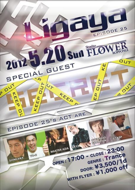 1000円オフのゲストディスカウントご希望の方はメッセージお願いします! 『Ligaya』EPISODE 25 @… FLOWeR(六本木) 5月20日(日) 17:00-23:00 GENRE:TRANCE DOOR:3500円/1d With Flyer:1000円OFF ■SPECIAL GUEST Secret ■GUEST SHINKAWA YO-C MASTER ASIA(from Osaka) ■Ligaya''s のりおSP ITARU ■VJ REi TOMiNAGA -------------------- 『リガル祭』 ■GUEST KAYA ■GUEST LIVE SET OVERHEAD CHAMPION ■Ligaya''s 芦澤教授 TAKESHI SHo☆tA けんちゃら