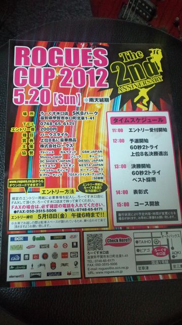 ろーぐす水口店で第2回sk8コンテストが開催されますよー 場所 ろーぐす水口店 SK8パーク 滋賀県甲賀市水口町北泉1-41 TEL 0748−65−6171 エントリー費 2000円 種目 パークスタイル 賞典 上位8名に豪華賞品 主催 株式会社ローグス