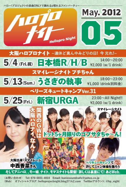 記念のver.30も無事終了! しかし立ち止まっちゃいられません。ver.31開催します! ---- “ベリーズキュートキャンプver.31” 日時:2012年5月25日(金)23:00〜All Night!! 会場:新宿URGA 03-5287-3390 住所:新宿区歌舞伎町2-42-16 第二大滝ビルB1F http://www.urga.net/ 料金:当日2000円(1ドリンク付) DJ:おくちゃん/雅サイ/メルティーローズ/etc. VJ:Honest Special Selector:ジム&ピロシ ☆出演者は予告なく追加・変更する場合があります。 大台のver.30を突破したベリーズキュートキャンプ、内容も