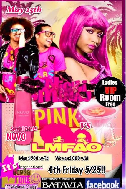 Okayama Clubs¼çºÅ¤Ç¤È¤¤¤¦Nicki Minaj PINK VS LMFAO¥Ñ¡¼¥Æ¥£¡¼¤ò³«ºÅ¤·¤Þ¤¹¡£ º£¤¬½Ü¤ÎNicki Minahj&LMFAOÃæ¿´¤Î¥ß¥å¡¼¥¸¥Ã¥¯¤òºÇ¶á¤Îή¹Ô¤ÎPitbull Afrojack,Kara, Gaga, Adele...¤Ê¤É¡¢¥Ï¥¦¥¹¤«¤é¥Ò¥Ã¥×¥Û¥Ã¥×¡£K-Pop¤È¿¥¤ê¸ò¤¼¤Æ¹Ô¤¯´¶¤¸¤Ç¿Ê¹Ô¤·¤Þ¤¹¡£ Nicki Minaj¤«LMFAO¤Ý¤¤¤ò°Õ¼±¤·¤¿¥¹¥¿¥¤¥ë¤Ç¤¯¤ì¤Ð¡¢12»þ¤Þ¤ÇOkayama Clubs¤è¤êNuvo¸À¤¦¥·¥ã¥ó¥Ú¥¤¥ó¤ò̵ÎÁ¤Ç°û¤á¤Þ¤¹¡£¥Ï¥ê¥¦¥Ã¥É¥»¥ì¥Ö¤äHiphop¥¢¡¼¥Æ¥£¥¹¥È¤¬¥¯¥é¥Ö¤Ç°û¤ó¤Ç¤¤¤ë¥ä¥Ð¤¤¥ä¥Ä¤Ê¤ó¤Ç¤¹¡ª ¾Ü¤·¤¯¤Ï¤³¤Á¤é http://iflyer.tv/event/105386/Okayama-Clubs-Nicki-PINK-VS