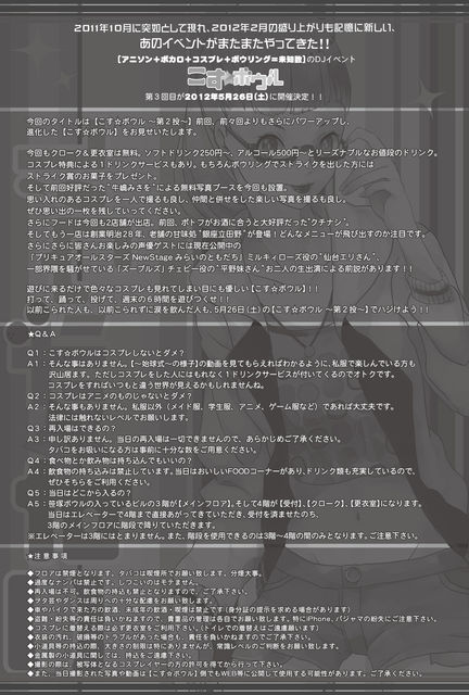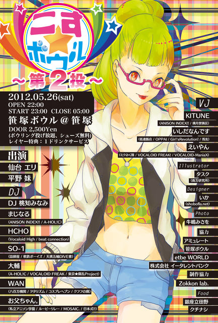 ※いよいよ明日!!当日の【タイムテーブル】を公開しました!! (5/25 更新) 前回、【こす☆ボウル 〜第1投〜】の様子 http://www.youtube.com/watch?feature=player_embedded&v=cKBpB_1XWx8 ----------------------------------------------------------------- 【日時】 2011.05.26(sat) 【時間】 OPEN 22:00〜 START 23:00〜 CLOSE 05:00 【場所】 笹塚ボウル @ 渋谷区笹塚 【料金】 2,500Yen (ボウリング投げ放題、シューズ代無料) 【特典】 コスプレ参加の方1ドリンクサービス 【tweetvit
