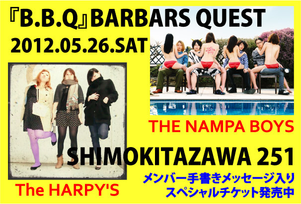第一章から約一年経ってしまいました。 が! やります! BARBARS自主企画ライブ! 第二章!!! 第一章よりも絶対にレベルアップしたイベントになる事まちがいなし!! 今から皆様、 しっかりと武器の準備をして、レベル上げして、予定空けて、決戦に備えておいてください!!!! メンバー一同今から気合い入りまくっております!!!! 2012年5月26日(土)@下北沢CLUB251 『B.B.Q』 BARBARS QUEST 〜第二章 かいしんのいちげき!251のダメージをくらわせろ!〜 OPEN18:30 / START19:00 料金:前売り2,000円 出演:BARBARS