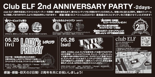 ★CLUB ELF 2nd ANNIVERSARY PARTY★ ゲストをお取りされたい方やご不明な点があれば、お気軽にメッセージをください。 急に行くことになってしまった方専用にELFのエントランスで スタッフに、 ★★★★★『ユウトのゲストでユウト』★★★★★ と言って頂ければ、 12時までの入場で 女性:入場無料!! 男性:1000円/2ドリンクで入場できます。 12時以降の入場でも 女性:1000円/2ドリンク 男性:1500円/1ドリンクで入場できます。 何名様でも確実に上記のゲスト料金で御入場して頂けるようにしておきますので御自由