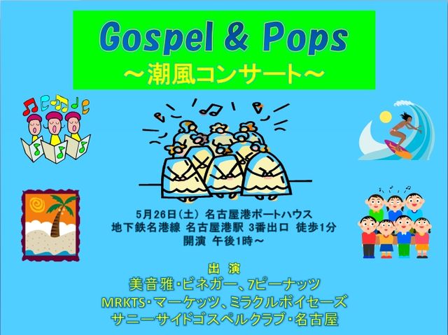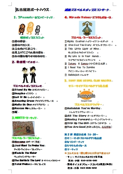 ※詳細が決まりましたので、謹んで告知申し上げます。 ☆出演予定チーム ?サニーサイドゴスペルクラブ・名古屋 30分 ?MRKTSマーケッツ(アカペラゴスペルユニット) 28分 ?ビネガー(ゴスペル&ポップスデュオ) 20分 ?セブンピーナッツ 25分 ?ミラクルボイセーズ(ゴスペルユニット) 28分 司会:こにたん 08:30 機材搬出 ・オレンジネット集合 09:00 設営開始/スタッフミーティング ↓ 10:30 10:35 サウンドチェック開始 ↓ 12:00 ↓ 昼食・休憩 13:00 開演 ↓ ?セブンピ