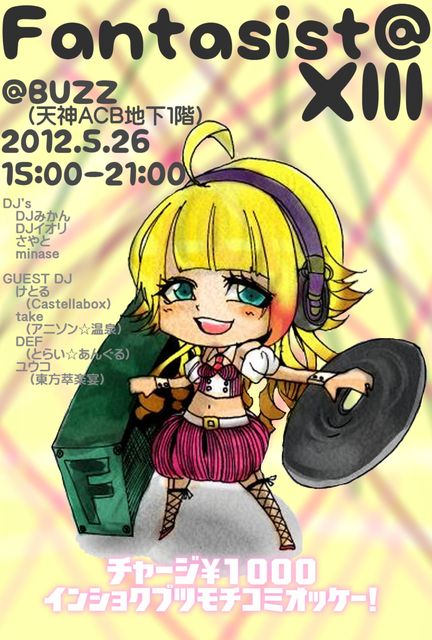 管理人様及びコミュニティー参加の皆様、告知失礼いたします。 Fantasist@13開催決定! デルタポップエクスタシー4の前日に開催しますので是非遊びに来てください♪ コスプレダンパFantasist@がBUZZに帰って来た! 2年ぶりのBUZZでの開催です♪ 【コスプレダンパとは??】 参加者がコスプレをして(コスプレしなくてもOK)参加し、 ディスコやクラブあるいはレンタルホールや公民館等の会場でアニメソングやゲームソング、J-POP、アイドル、V系、ダンスミュージックなど、さまざまなジャンルの楽曲で踊ったり打ったり