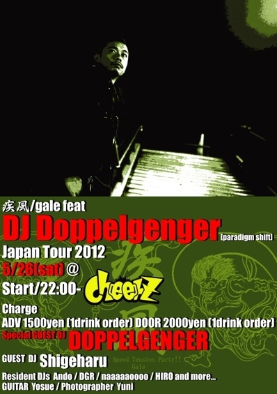 管理人様、告知失礼致します。 疾風/gale feat.DJ Doppelgenger [ paradigm shift ] Japan Tour 2012 5/26(sat) @Cheerz Start/22:00- ticket ADV 1500yen (1drink order) DOOR 2000yen (1drink order) Special GUEST DJ DOPPELGENGER GUEST DJ Shigeharu Resident DJs Ando DGR naaaaaoooo HIRO and more... GUITAR Yosue Photographer Yuni ーGUEST PROFILEー 【DJ DOPPELGENGER】-special guest- (MAMMOTH DUB,Back To Chill,Kaikoo,Cyberpunk,Vision) 15歳からDJキャリアを