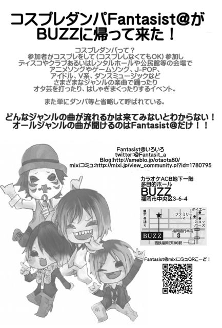 Fantasist@13開催決定! コスプレダンパFantasist@がBUZZに帰って来た! 2年ぶりのBUZZでの開催です♪ 【コスプレダンパとは??】 参加者がコスプレをして(コスプレしなくてもOK)参加し、 ディスコやクラブあるいはレンタルホールや公民館等の会場でアニメソングやゲームソング、J-POP、アイドル、V系、ダンスミュージックなど、さまざまなジャンルの楽曲で踊ったり打ったりはしゃぎまくったりするイベント。また単にダンパ等と省略して呼ばれている。 どんなジャンルの曲が流れるかは来てみないとわからない!