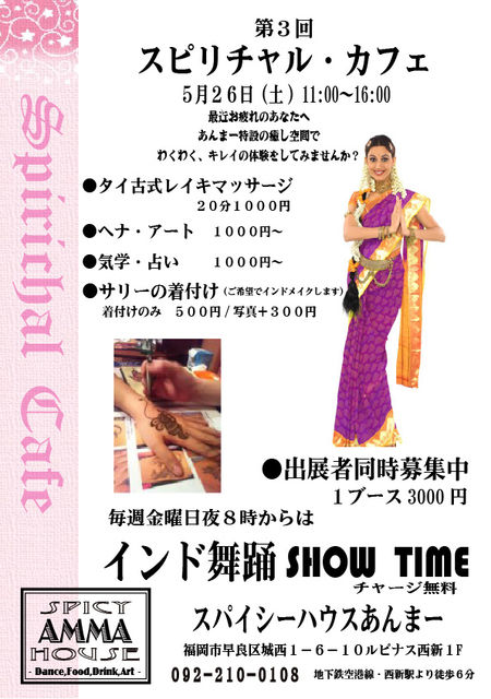 5月26日は第3回スピリチャルカフェ@あんまーです。 今回は「きれい」をテーマに、タイ古式レイキマッサージ、へナアート、気学+占い、そしてサリーの着付けをします。ご希望の方には「インド風メイク」もします。記念に写真を持って帰っていただくことも出来ます。 ●タイ古式レイキマッサージ 20分 1000円 ●へナ・アート 1000円より ●気学、占い 1000円より ●サリーの着付け 500円(ご希望によりインドメイクもします。+300円でお写真をお持ち帰りいただけます。 ブースの出展者も同時に募集中ですので、詳し