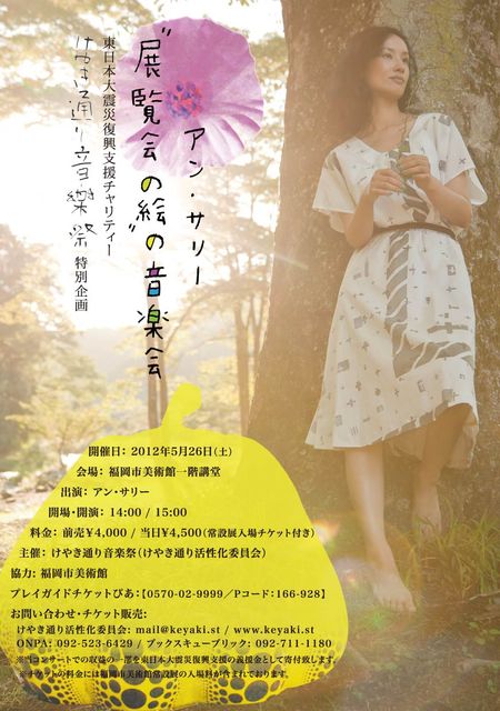 管理人様 イベント告知失礼致します。 アン・サリーさんの福岡でのコンサートのお知らせです。 けやき通り音楽祭 特別企画 東日本大震災復興支援チャリティ “展覧会の絵”の音楽会〜アン・サリー コンサート〜 ◎コンサート詳細: 日時: 2012年5月26日(土) 会場: 福岡市美術館一階講堂 (福岡市中央区大濠公園1-6 福岡市美術館内1F) 出演: アン・サリー 開場・開演: 14:00/15:00 料金: 前売¥4,000/当日\4,500(常設展入場チケット付き) WEB:けやき通り音楽祭 特設ページ http://www.facebook