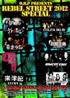D.R.P PRESENTS "REBEL STREET 2012 SPECIAL-博多編" 5/26(土)福岡SPIRAL FACTORY OPEN 17:30/START 18:00 ADV \2500/DOOR \3000(+1DRINK ORDER) <CAST> ロリータ18号 ゲタカルビ 刹那主義 ADAMOSTE KINGS 暴走ライン LUCKY CAT MOTEL LUCKEY[来津紀] <TICKETS>2/26 GO SALE イープラス(http://eplus.jp) D.R.P http://id43.fm-p.jp/241/deadrockpro/ <問> SPIRAL FACTORY 092-741-3575