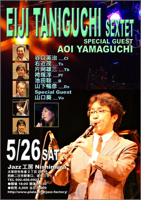 やってきます、谷口英治セクステット。 語る必要がないほど、現在のジャズクラリネット界トップに君臨する谷口英治。 オーソドックスなジャズのスタイルとコンテンポラリーなセンスが絶妙のバランスでブレンドされたフレキシビリティのある音楽性を活かし、トラディショナルからモダン、ラテン、ビッグバンド、吹奏楽、民俗音楽、クラシックにいたるまで国内外の様々なアーティストのセッションに参加し、クラリネットミュージックの領域を広げている谷口英治。 今回は早稲田大学時代から親交のあるボーカリスト、山口葵をスペシャルゲストに迎え、