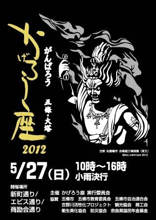 自由市場 第20回 かげろう座 http://www.gojo.ne.jp/yamayoh/sin/kage2012/index.htm(詳細) 重要伝統的建造物群保存地区に選定された、江戸時代からの町屋が残る五條新町で、関西最大と言われるフリーマーケット『かげろう座2012』が開催されます 民家の軒先を借りて、県内、大阪、中部などから陶芸、手芸、木工、食品、園芸などを約400店舗が出店、ライブや大道芸なども披露されます。 運営する実行委員会メンバーの高齢化などにより、今回のかげろう座でファイナルとなります。 開催日時:2012年5月27日(日)10時〜16時
