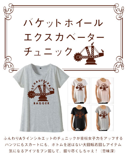 2012/05/27/23:59〆切でした。 たくさんのオファーありがとうございました! ===以下リリース時の告知文となります=== 一部熱狂的女子アイテム推進派に屈して投入! 【バケットホイールエクスカベーターチュニック】 ふんわりAラインシルエットのチュニックが重機女子力をアップする パンツにもスカートにも、ボトムを選ばない大回転着回しアイテム 気になるアイツをブン廻して、掘り尽くしちゃえ!(意味深) Size* レディースワンサイズオンリー Color*4 ホワイト/ベビーピンク/ブラック/ヘザーグレー