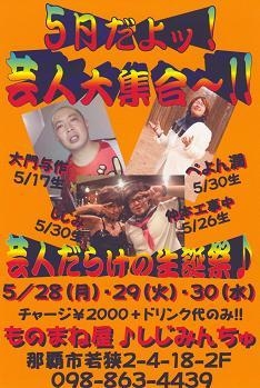 【ものまね屋しじみんちゅ】5月のイベントdayは、5月生まれの芸人を招いての【芸人だらけの生誕祭】をパックリ貝催しちゃいます 5月17日生まれの『太田プロの最終兵器』こと初登場の【大門与作】くん 5月26日生まれの『しじみんちゅの用心棒』こと【仲本工事中】くん 5月30日生まれの【ぺよん潤】くん&私しじみ 皆さん、お祝いにいらしてくださいッ 御予約承り中で〜す 【ものまね屋しじみんちゅ】 那覇市若狭2-4-18 23ビル2F 098-863-