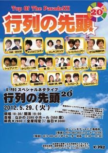 ■〜K-PROスペシャルライブ〜『行列の先頭20』 【日にち】2012/5/29(火) 【時間】開場18:30/開演19:00 【会場】なかのZERO小ホール(550席/中野駅南口徒歩5分) 【住所】中野区中野2-9-7 / 電話03-5340-5000 【料金】前売¥2800-(全席指定)/当日¥3000- ★ローソンチケットにて発売中! 【電話】0570-084-003(Lコード:32326) 【出演】キングオブコメディ、エレキコミック、POISON GIRL BAND、囲碁将棋、THE GEESE、うしろシティ、磁石、トップリード、タイムマシーン3号、鬼ヶ島、ラバーガール、エルシャラカーニ、三拍子、