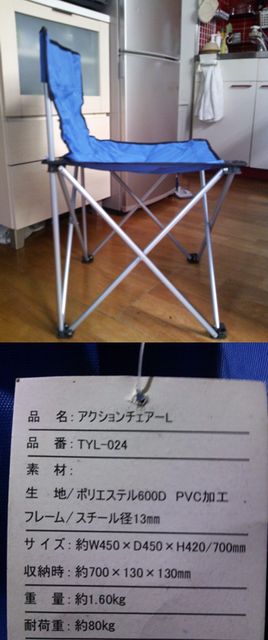 ※先着順ではございません。 ※希望の数をコメント欄にカキコミお願いいたします。 2脚希望だと送料負けするかも知れません。 【商品説明】 これからの時期に活躍する折りたたみチェアー新品で17台あります 画像の様に良くある折り畳み出来て袋に収納できる椅子です。 サイズW450×D450×H420or700 重量1.6kg 耐荷重80Kg MADE IN CHINA 【条件】※お引き渡し後は破損や使用上のケガなど免責で願います。 【発送について】 ◆基本的にヤマト宅急便着払い発送(元払いにも対応いたします) ※