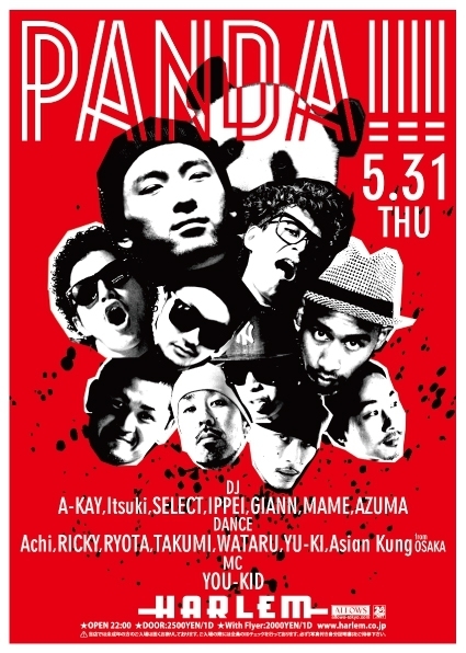 5/31 PANDA!!!@HARLEMのディスカウントゲスト ハーレムのエントランスにて ★☆★☆★☆★☆★☆★☆★☆★☆ 『アローズのゲストでパンダ』 と言えば通常2500かかる所を1500/1d で入れます ★☆★☆★☆★☆★☆★☆★☆★☆ 詳細 PANDA!!!@HARLEM OPEN22:00 DOOR2500/1d DJ A-KAY Itsuki SELECT IPPEI GIANN MAME AZUMA DANCE Achi, Ricky, RYOTA, TAKUMI, WATARU, YU-KI, Asian Kung from OSAKA MC YOU-KID 今クラブシーンで活躍するDJ及びDANCERにスポットライトを当てたイベントPANDA