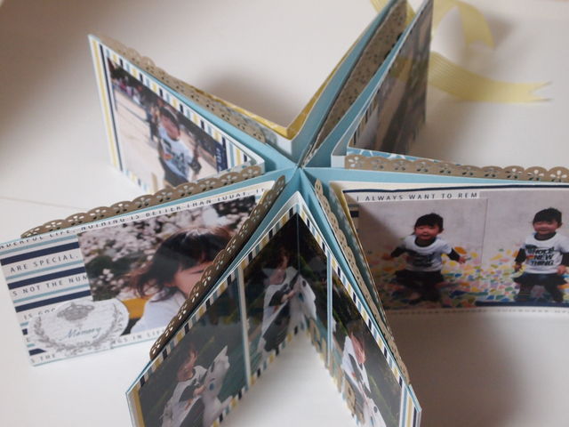こんにちは!! やっと暖かくなって(むしろ暑いぐらいですが)きたと思ったら、変なお天気が続きますね みなさん体調崩されないようにお気を付けくださいね!! 5月18日・19日にイベントを控えておりますので、バタバタしております アップが遅くなりまして申し訳ありません (って、最近いつもアップが遅いですよね。。。申し訳ありません) 今月は最近リクエストの多い、スターブックの講習をしたいと思います!! スターブックはその名の通り、広げるとスター(星)の形になるミニアルバムです たくさ
