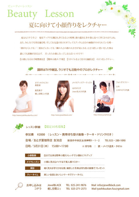 みなさん、こんにちは 5月のビューティーイベント第二段 モノリスのビューティー女子会に引き続き、今度はビューティーレッスン小顔編になります 定員 10名 (定員になり次第募集終了します。) 詳細 Beauty Lesson 夏に向けて小顔作りをレクチャー 夏はもうすぐそこ! 髪をアップする機会も多くなるこの時期。 顔の露出も冬や春に比べて多くなりますよね。 また、みんなで写真を撮る時、そしてお友達のBLOGやフェイスブックに自分の画像がのせられていた時… 「顔がむくんで