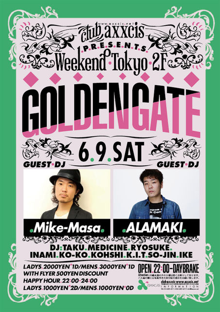 ※管理人様、イベント告知失礼いたします。不適切なようでしたら即削除いたします。 1000円ゲスト 渋谷 club axxcis 土曜 GoldenGate 説明不要、JapaneseHipHopシーンを黎明期から支えて来たHASEBE,WATARAI,KEN-SKEの3人が圧倒的迫力で2Fをブチ上げます エントランスにて ★★★★★★★★★★★★★★★★★★ 『アローズのゲストのmixi』 ★★★★★★★★★★★★★★★★★★ とお伝え頂ければ、通常¥2500/1dのところ 12:00まで1000円、12:00以降¥1500/1dに 何名様でもお使い