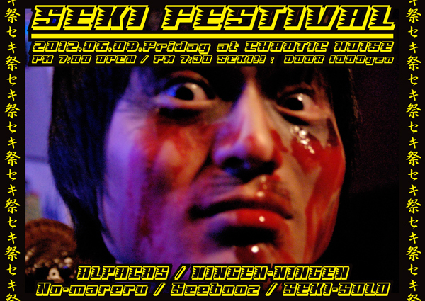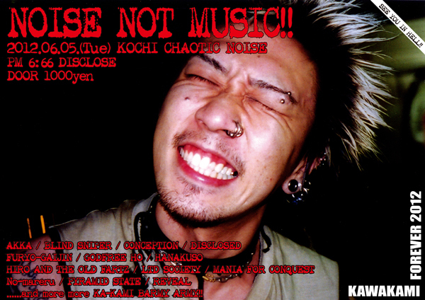今週一本目6月5日(火)は、KA-KAMI氏(DISCLOSE/GOATWORSHIPPER)の追悼ライブ第一弾!! 今年もKA-KAMI氏のの名の下に集まった四国のバンドが繰り広げる大暴走ナイト!! 続く二本目6月8日(金)は、店のブログをチェックしてる方なら一度は目に、もしくは耳にした事はあるであろうドMドラマー"セキ"が、所属する4バンド+ソロでお送りするセキづくしで自身を酷使するドMドラマーにうってつけのライブ、その名も"SEKI FESTIVAL 2012"!! ラスト三本目6月9日(土)は、KA-KAMI氏(DISCLOSE/GOATWORSHIPPER)の追悼ライブ第二弾!! 大阪より空爆スカンジD-BEA