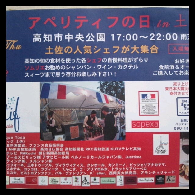 アペリティフの日in土佐 高知市中央公園 17:00~22:00雨天決行 土佐の人気シェフが大集合 高知の旬の食材を使った各シェフの自慢料理が ずらり!! ソムリエお勧めのシャンパン、ワイン、カクテルから スィーツまで 思う存分お楽しみ下さい♪ ********