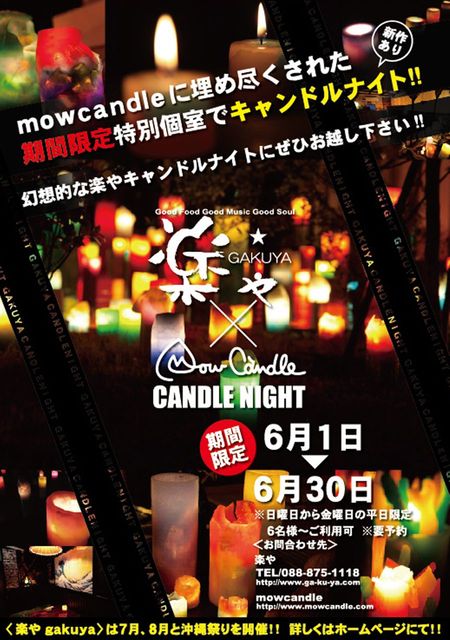 キャンドル作り始めた時からずっとお世話になってる「楽や」で本日から6月30日までキャンドルを楽しめる特別個室が楽しめます!※日曜から金曜までの平日限定。 6名から予約可なので、かなり贅沢な空間でお酒が飲めます! 要予約なので、予約してくださいね! かなり大きめのグラデーションや大きな「jewel」もあります! こんなチャンスはそうそうないっす! 6月いっぱいやってます、街に飲みに行ったらぜひ「楽や」にお越しください!! 予約、問い合わせは0888751118(楽や)まで! (楽や)http://www.ga-ku-ya.com/