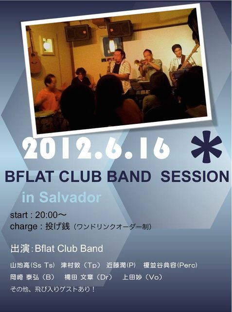前回、大好評だったラテンジャズセッションの第2段です! なんと!!入場無料(1drink別途注文してね!) 2012年6月16日(土曜日) Special funky jazz live !! BflatClubBand Session in Salvador ☆ ... 投げ銭ライブact. 山地 高(Tenor.sax / Soprano.sax/ Leader) 津村 敦(Trumpet / Flugelhorn) 近藤 潤(Piano) 岡崎 泰弘(Bass) 橋田 文章(Drums) 榎並谷 典容(Percussion) Guest Vocal 上田妙 他飛び入りゲストあり!? open 19:00 start 20:00 1st.stage 20:00~,2nd.stage 21:00~,3rd.stage 22:00~ ※