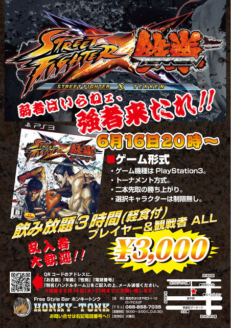 ストリートファイター×鉄拳 開催日 6月16日(土) 開催時間 20時〜 飲み放題3時間(軽食付き) プレイヤー&観戦 ALL \3,000 ■ゲーム形式 ・ゲーム機種はPlay Station 3 ・トーナメント形式 ・二本先取の勝ち上がり ・選択キャラクターは制限無し ※観戦者の乱入も大歓迎!! 参加される方は下記連絡先まで 連絡先:088-855-7035