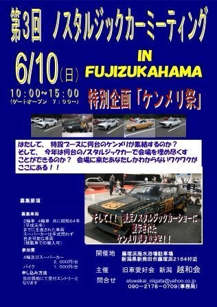 管理人様 スペースお借りいたします ケンメリ祭atノスタルジックカーミーティング 新潟 越和会 主催 第3回ノスタルジックカーミーティング 今年は『ケンメリ祭り』です イベント日時: 6月10日(日)10:00〜15:00(受付7:00〜) 場所: 藤塚浜海水浴場駐車場 新潟県新発田市藤塚浜2164付近 R113セブンイレブン前 日時 6月10日(日) ゲートオープン7時 イベント10〜15時 *** 参加条件 *** 昭和に製作された日本車及びバイク スーパーカーは年式問わず イベント参加費 4輪2,0