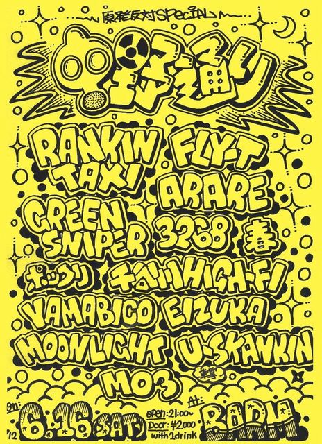 管理人様告知失礼いたします。 中野通り~原発反対SP~ 2012.6.16(SAT) at BARM 新潟県南魚沼市六日町107-1 2F OPEN 21:00~ DOOR 2000YEN with 1D RANKIN TAXI FLY-T ARARE GREEN SNIPER 千谷川HIGH-FI 3268 YABABICO ポックリ EIZUKA 春 MOON LIGHT 車掌 U-SKANKIN 詳細 BARM BLOG http://barmbill.blog22.fc2.com/blog-entry-367.html お問い合わせ barmbill@gmail.com