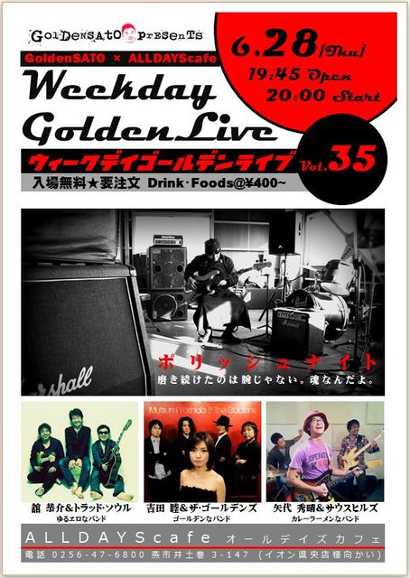 ポリッシュナイト 「磨き続けたのは腕じゃない。魂なんだよ。」 ポリッシュK3がベースを弾き倒し、 倒れます!! 開場/19:45 開演/20:00 料金/無料(要注文) 出演者/ ○舘恭介&トラッド・ソウル ゆるエロなバンド ○矢代秀晴&サウスヒルズ カレーラーメンなバンド ○吉田睦&ザ・ゴールデンズ ゴールデンなバンド 会場/ オールデイズカフェ 住所/燕市井土巻3-147 電話/0256-47-6800 交通アクセス/ 北陸道三条燕ICから車5分