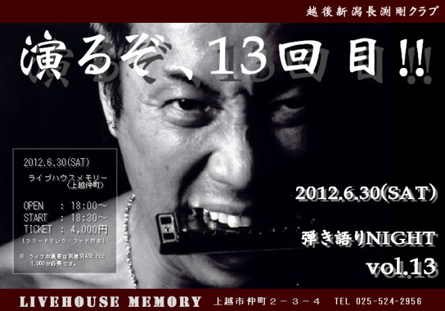 我らがツヨシもNew Album、全国ツアーと勢いに乗っている今日この頃ですね(^^)! さて、来たる6/30(土)、上越仲町ライブハウスメモリーにて「越後新潟長渕剛クラブ 弾き語りNIGHT vol.13」、催行決定しました!! 詳細はまた後ほど追って連絡しますが、一応いつもの通りフリードリンク&フリーフード付で1人4,000円(ライブ出演者は+α)、参加者によるリレーライブ(剛の歌オンリー)を楽しみながらのライブパーティー、って感じです♪ もしご都合がつくようでしたら、是非たくさんの参加をお待ちしております(^^)! とりあえず、「参