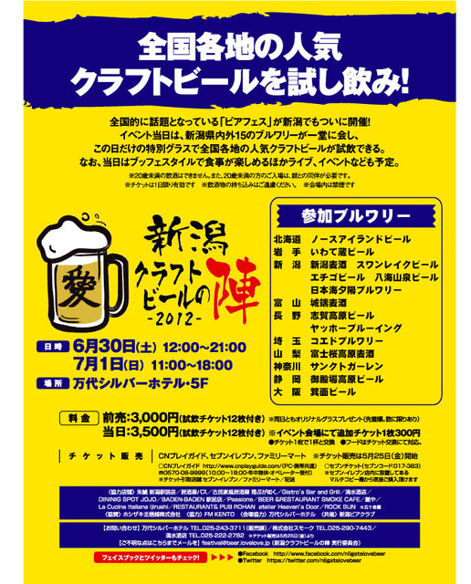 6/ 30(土)、7/1(日)、新潟市「万代シルバーホテル」で「新潟クラフトビールの陣」が開催されますが、 これのイベントに便乗しまして 6/ 30(土)、行ってみたい新潟のしょっぺ店コミュニティの第一回のオフ会を開催します! 以下、クラフトビールの陣インフォメーションです。 会場:万代シルバーホテル5階 6月30日(土) 12:00〜21:00 7月 1日(日) 11:00〜18:00です。 ラストオーダーは終了時間30分前。 チケットは 前売:3,000円 当日:3,500円(試飲、フードに使えるチケット12枚付き) ※イベント会場にて追加チケッ