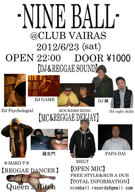 管理人様 告知失礼します。 -NINE BALL- VOL.3 2012.6.23 (Sat) 【PLACE】 CLUB VAIRAS 新潟県上越市仲町3-1-1(club nova跡) 【OPEN】 22:00 【DOOR】 1,000円 【DJ & REGGAE SOUND】 DJ Psychological DJ GAME ROCKERS KING DJ 鵺 DJ eight skillz 【MC & REGGAE DEEJAY】 ☆MAKO-T☆ 羅生門 MELT PAPA-DAI 【REGGAE DANCER】 Queen'z Bitch 【OPEN MIC】 FREE STYLE & RUB A DUB 【mixi NINE BALL community】 http://mixi.jp/view_community.pl?id=5893022